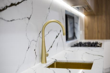 Polyurethane to kitchen bench and overhead cupboards with soft close action to drawers and cabinet doors.